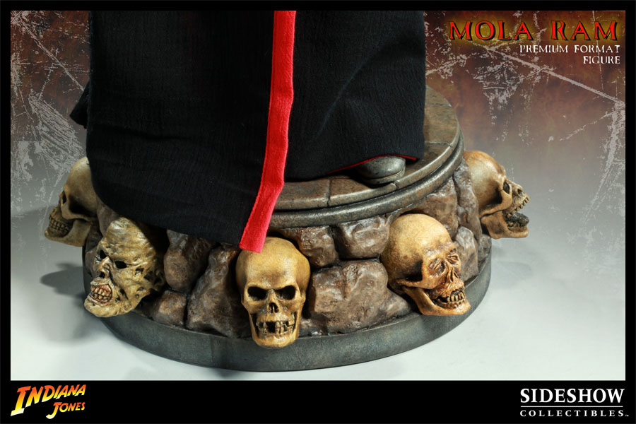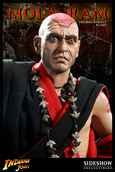 The Mola Ram Premium Format figure presents one of Indiana Jones' most memorable adversaries in stunning detail. Each piece is individually painted and finished to exacting standards, each with its own unique quality and detail that is the trademark of a handcrafted Sideshow Collectibles product. Clothed in real fabric robes and wearing two detailed necklaces, Mola stands over 25 inches tall atop a base adorned with eight unique skulls. Mola Ram comes complete with two switch-out heads, featuring a headdress option with real hair detailing, and two switch-out hands, including a human heart engulfed in flames. The Mola Ram Premium Format Figure is the perfect addition to any display, an essential part of your Indiana Jones collection.