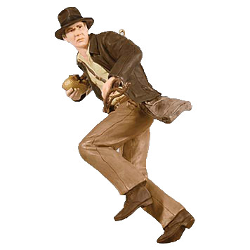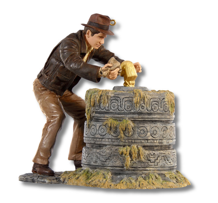 In a hidden temple deep inside the jungles of Peru, Indiana Jones - professor, archaeologist, and treasure hunter - seeks an ancient golden idol. Armed with his bullwhip, pistol, and signature fedora, Indy sidesteps a series of booby traps to reach the treasure, which he cautiously removes and replaces with a bag of sand. Just when he appears to have succeeded in his quest, the temple crumbles and a huge boulder barrels down upon him. Luckily, Indy escapes Peru alive, but will his luck hold as he takes on the Raiders of the Lost Ark? Press the button on the ornament to hear music from The Raiders March.
