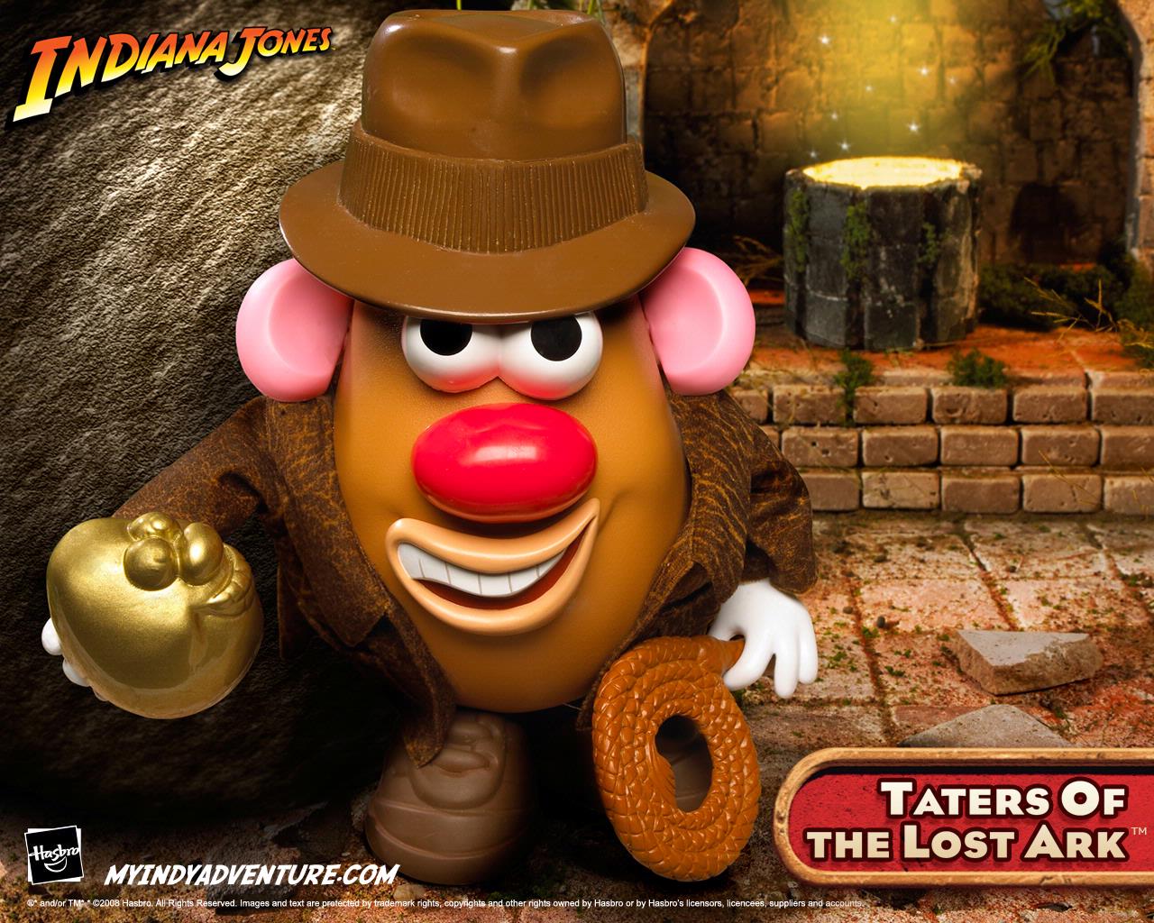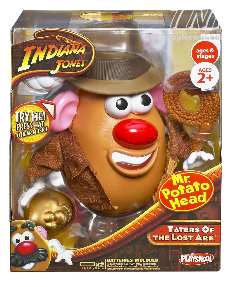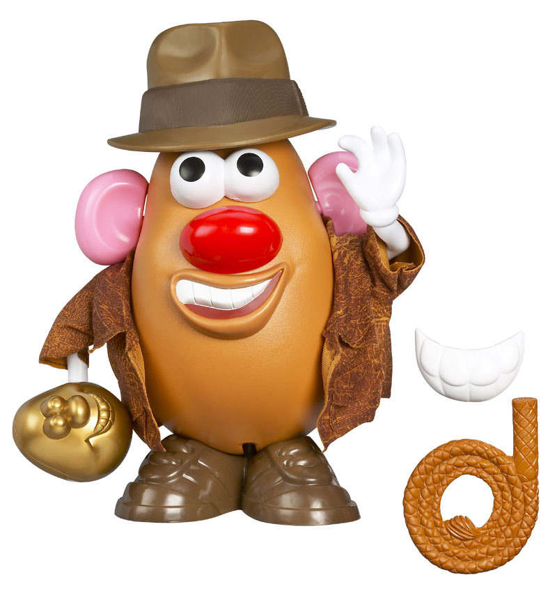 Unearth this silly spud toy from its packaging and use your imagination to create all sorts of wacky looks fashioned after the famous action hero. Complete with bullwhip and gold-colored idol in hand, this silly character can sport his jacket and fedora. Press and release the fedora to hear three different short segments from the "Indiana Jones" theme song - or hold it down to hear it play straight through. Whip up loads of fun as you mix and match the pieces to fit anywhere on the potato body.