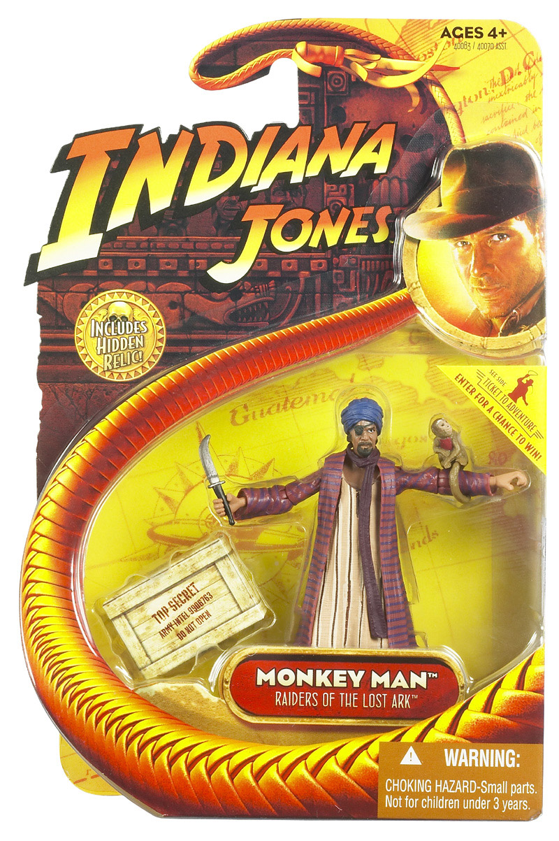 Add to the adventure - and to your collection! - with this detailed figure! Monkey Man figure comes dressed in a colorful robe and caftan with a mysterious-looking eye patch. With his "pet" monkey perched on his arm, this posable figure clutches a weapon in his hand and also comes with a top-secret hidden relic for you to discover! Will Indy escape the evil attempts on his life? Will the Monkey Man be victorious? Recreate exciting scenes from the classic Indiana Jones film, Raiders of the Lost Ark, with this sinister-looking figure!