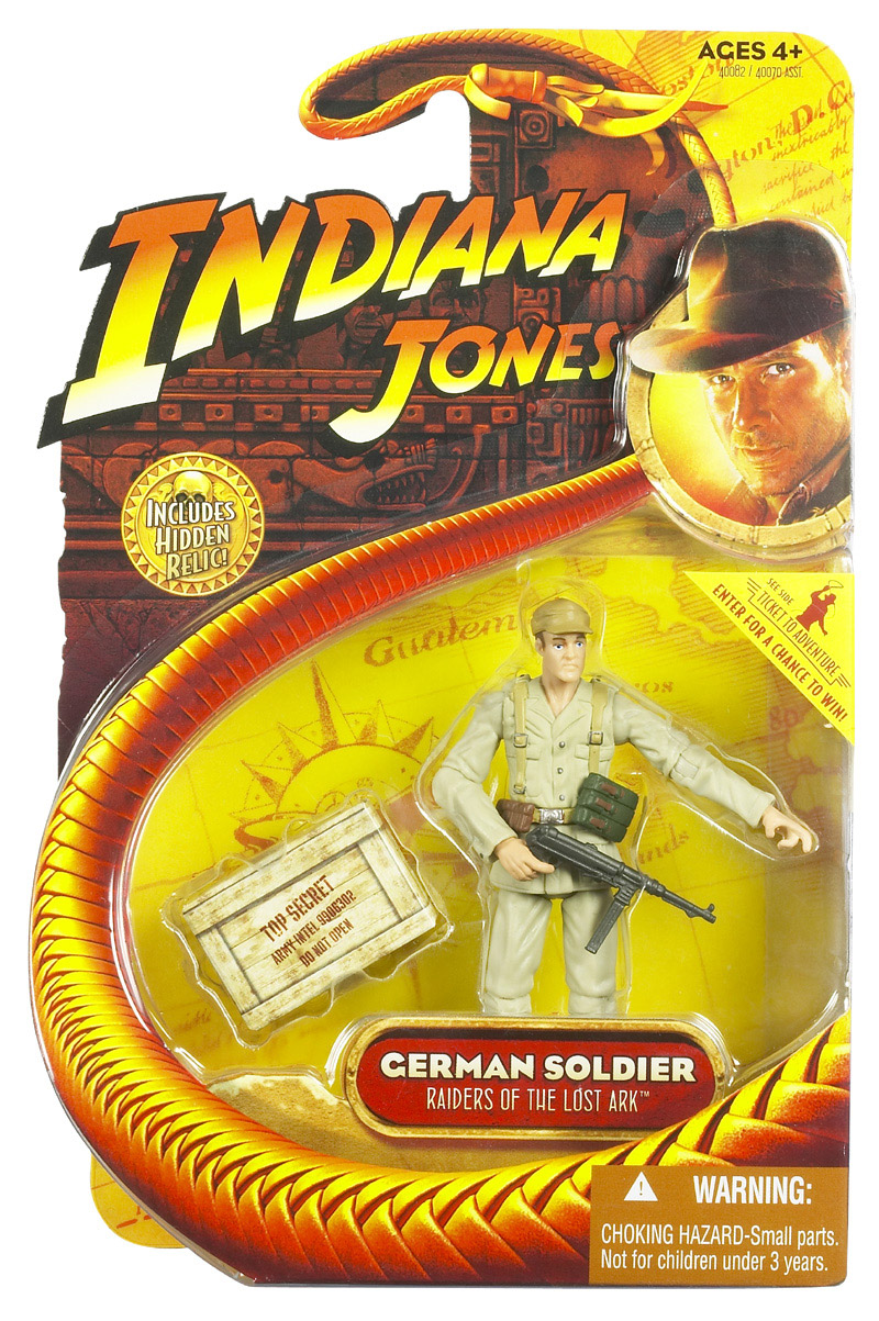 Add to the adventure - and to your collection! - with this detailed figure! Dressed in uniform with his "ammo" secured to his belt, this is one serious soldier! Clutching his rifle, the posable figure stands guard beside a top secret hidden relic that you can reveal! Recreate exciting and memorable scenes from the classic Indiana Jones film, Raiders of the Lost Ark!