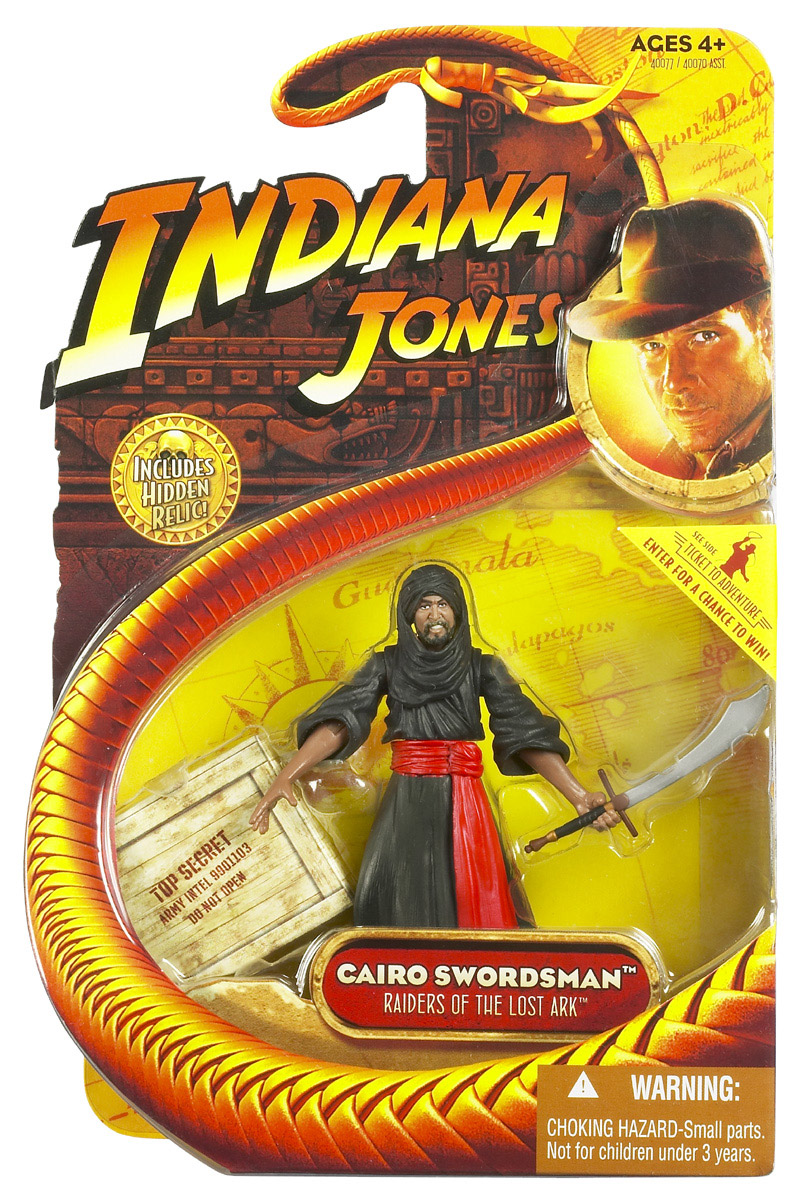 Add to the adventure - and your collection! - with this sinister-looking figure! Challenge this sword-wielding enemy to a duel and swipe the hidden relic in the process! Dressed in a long, black robe and head wrap, this posable figure is ready for a sword-swinging showdown. And only you can decide who will win! Recreate exciting and memorable scenes from the classic Indiana Jones film, Raiders of the Lost Ark!