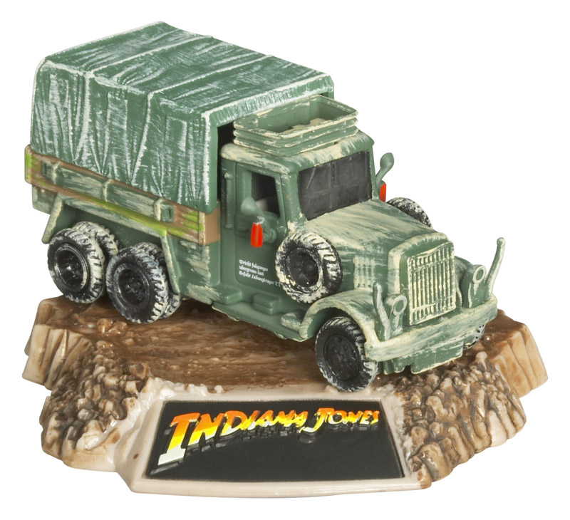 Relive the thrilling Indiana Jones action scene with this scaled-down version of the German army cargo truck, complete with an Indy figure trailing behind it! A removable canopy, mud-splash deco and loads of detail make this die-cast collectible a welcome addition to your collection.