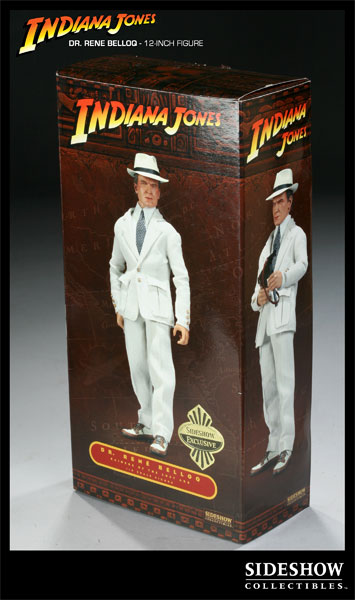 What's in the box: 12-inch prometheus male body with 30+ points of articulation, authentic likeness of Paul Freeman as Reni Belloq, shirt, tie, jacket, pants, belt, shoes, MP-40 machine pistol with magazine and strap, hat, pocket watch with chain, interchangeable fist and pistol right hands, interchangeable fist and gripping left hands, liquor bottle, display base with Indiana Jones logo.