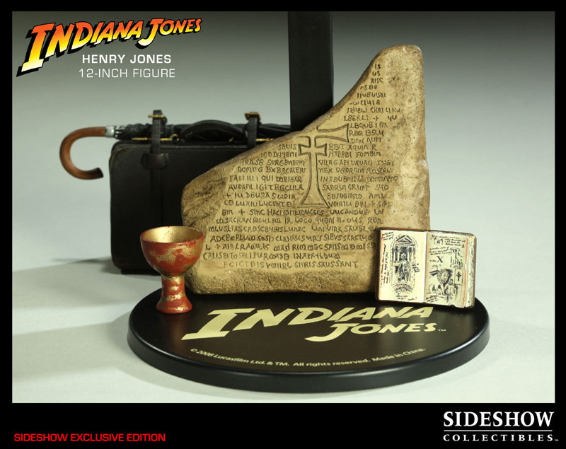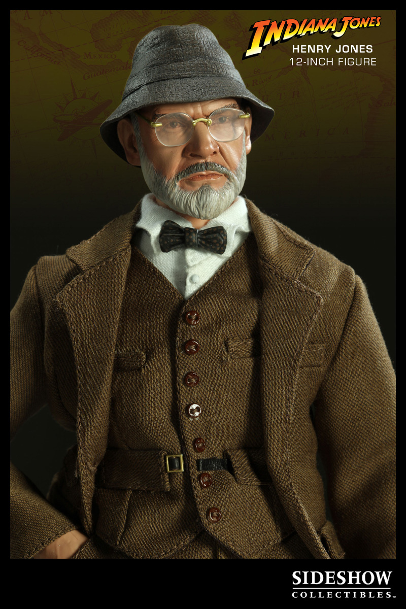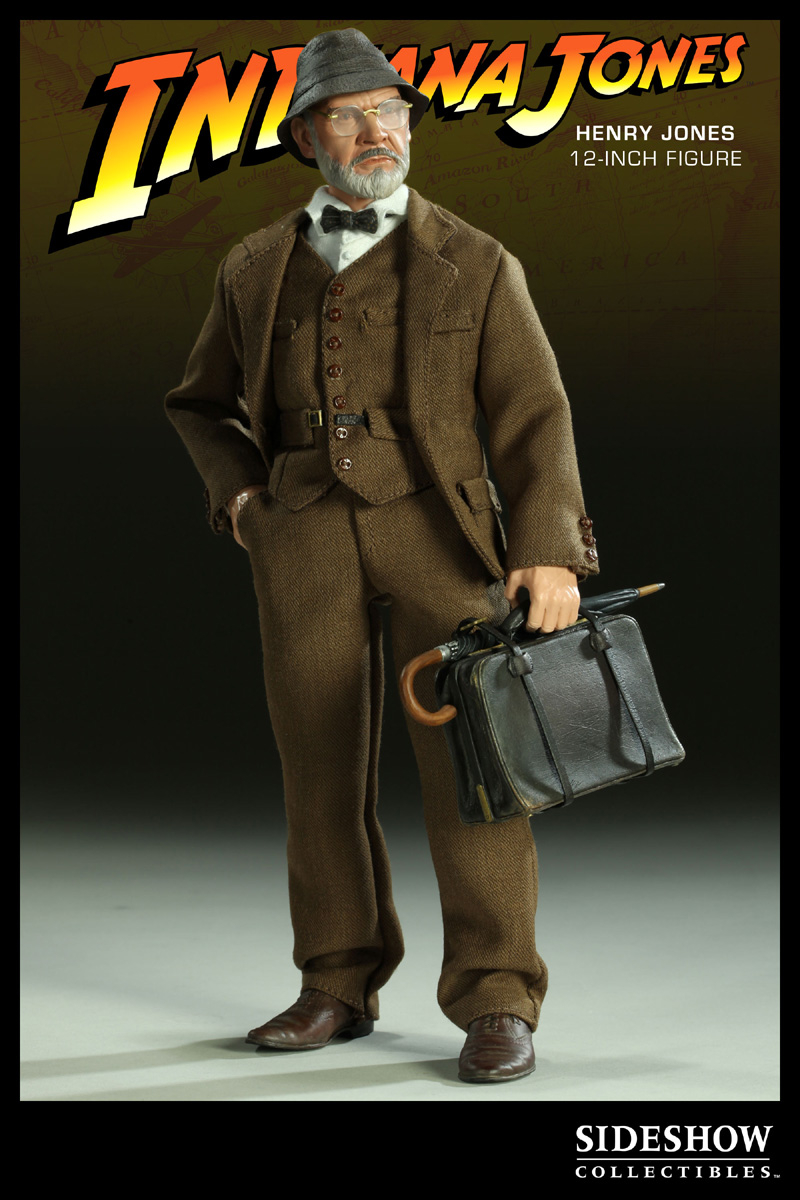 What's in the box: 12-inch Pro male body with 30+ points of articulation, authentic likeness of Sean Connery as Henry Jones, shirt, vest, pants, shoes, bowtie, removeable hat, glasses, briefcase, umbrella, grail diary, Holy Grail, display base with Indiana Jones logo.