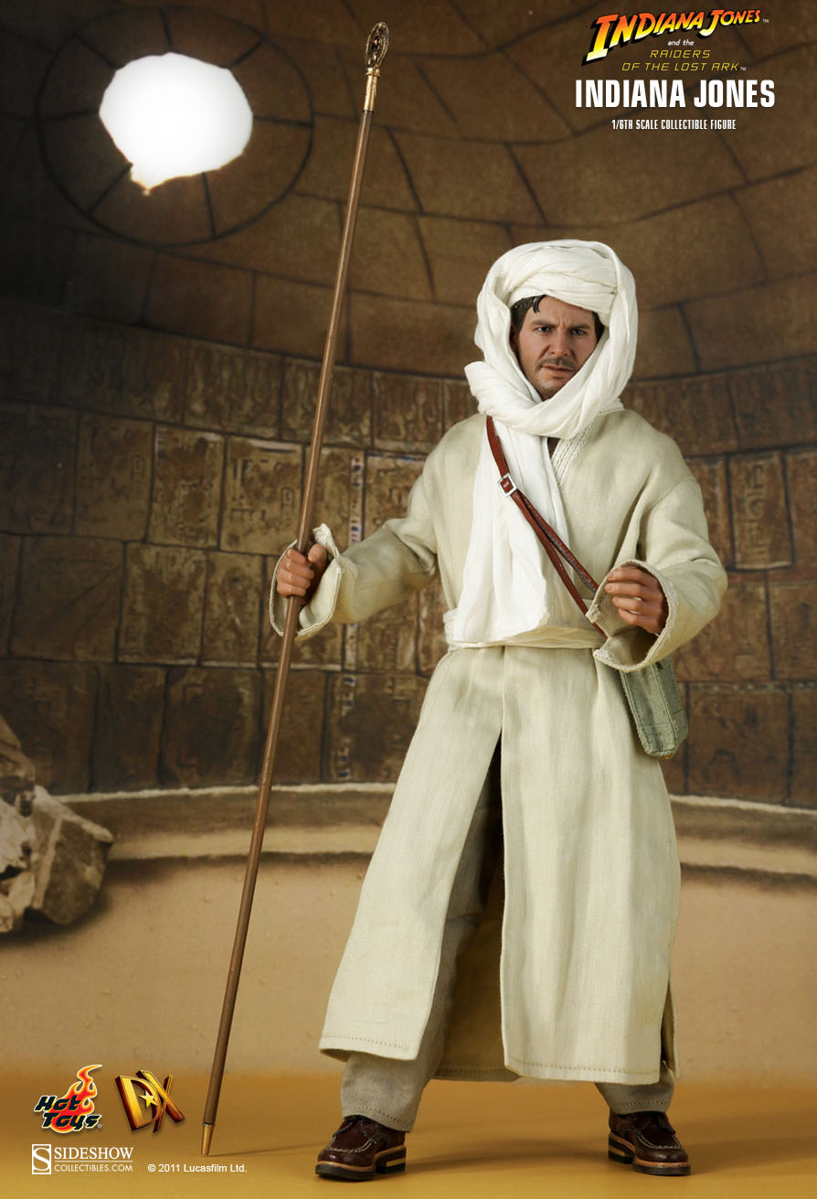 What's in the box: Authentic, detailed, fully realized likeness of Harrison Ford as Indiana Jones in Raiders of the Lost Ark, newly developed, hand-painted head sculpt with Parallel Eyeball Rolling System (PERS), movie-accurate facial expression with detailed wrinkles, skin texture and beard, two hair styles, including one for wearing fedora and one for wearing headscarf. Stands approximately 30 cm tall, muscular body with over 30 points of articulation, five pairs of interchangeable palms including: pair of faux-leather gloved fists, pair of faux-leather gloved palms for holding pistols, pair of relaxed palms, pair of fists, pair for holding pistols. Two sets of clothing. Style 1: faux-leather brown jacket with zip and pouches, khaki shirt with pouches, pair of khaki pants, brown fabric belt, faux-leather brown belt with buckle for linking to whip and pistol holster, brown fedora. Style 2: one-piece beige Arab garb with waistband, white headscarf, pair of nude shorts under pants, pair of black socks, pair of faux-leather brown short boots, two pistols including one with faux-leather holster, authentic leather whip for matching with style 1 costume, Staff of Ra with Headpiece for matching with style 2 costume, shoulder bag with venting details, sand bag, electroplated golden Fertility Idol, pedestal, journal made of authentic paper, figure stand with Indiana Jones nameplate and movie logo, double-sided movie-accurate backdrop, figure stage with metal plate movie logo and MMS DX series title.