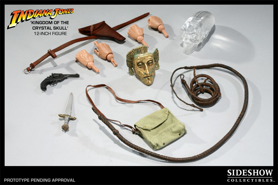 What's in the box: 12-inch pro male body Version 1.0 with 30+ points of articulation, authentic likeness of Harrison Ford as Indiana Jones, hat, shirt, pants, belt, faux-Leather Jacket, boots, revolver, detailed belt with holster, coiled bullwhip with tie, articulated bullwhip, satchel, Nazca dagger, Orellana mask, crystal skull, two sets of interchangeable gloved hands, two sets of interchangeable bare hands, display base with Indiana Jones logo, display base with Indiana Jones logo.