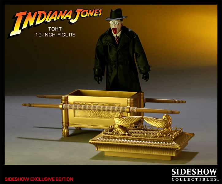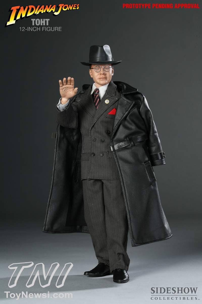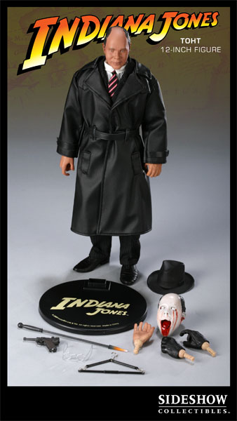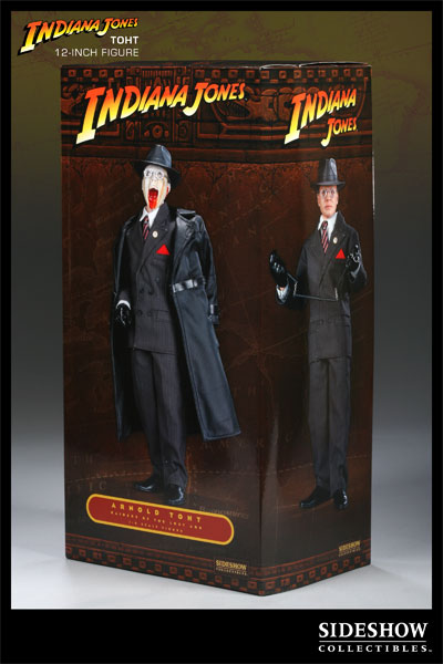 What's in the box: 12-inch prometheus male body with 30+ points of articulation, authentic likeness of Ronald Lacey as Major Arnold Ernst Toht, shirt, pants, tie, jacket, trench coat with belt, shoes, hat, glasses, switch-out melted portrait, gloved right pistol hand, gloved left support hand, ungloved right pistol hand, ungloved scarred right salute hand, luger pistol, hot poker, collapsable coat hanger w/ chain, display base with Indiana Jones logo.