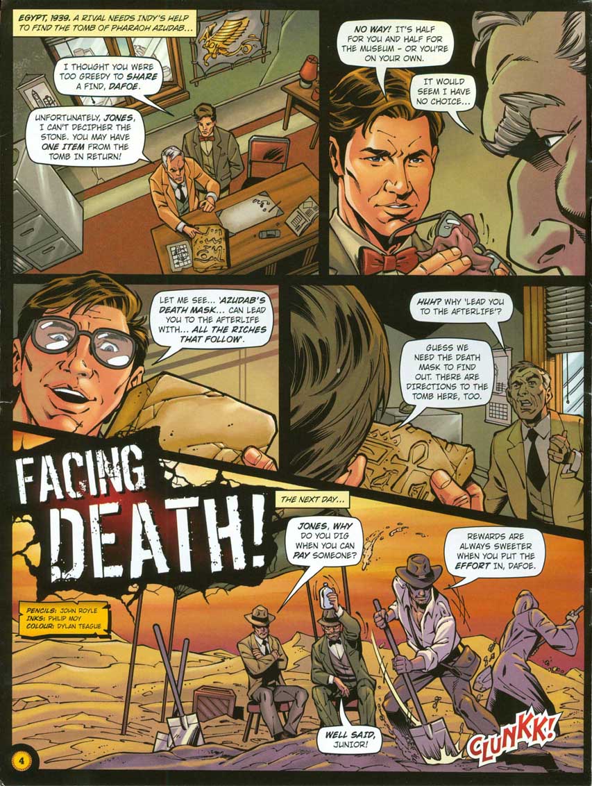 In Egypt, 1939, Indiana Jones is approached by a rival of his named Dafoe who needs Jones's help in deciphering a stone that will lead to the tomb of Pharaoh Azudab the Great. Jones agrees on the condition that half of the find will go to the museum. In addition to a map to the tomb, the stone contains a message: "Azudab's Death Mask... can lead you to the afterlife with... all the riches that follow". Jones figures that they'll need the death mask for the answer and the next day the pair are joined by Jones's father, Professor Henry, Sr, and Dafoe's hired digger, Ahmed. While Dafoe relies on Ahmed to do the work, Indiana choses to dig for himself but it is Ahmed that uncovers the entrance. |
