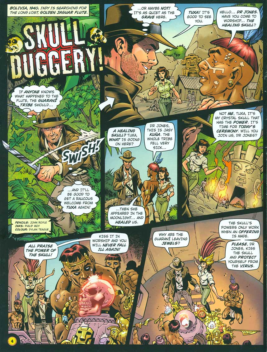 Bolivia, 1940: Indy approaches his old friend Tuxa from the Guarani about the long lost golden jaguar flute. American botanist Josie Kelland has brought the tribe a crystal healing skull, which cures them when they make an offering of jewels and kiss it. Indy discovers Josie is poisoning the tribe with belladonna. He cures the tribe with toadstools and catches Josie before she can poison the tribe fatally and flee with their treasures. The tribe gives Indy the "ugly" flute, which he plays badly. |
