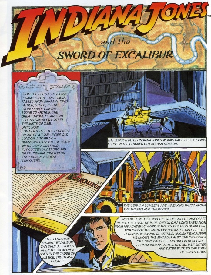On a long sabbatical from his academic work in the States, Indiana Jones spends the whole night engrossed in research in the British Museum during the London blitz. He is searching for one of the main obsessions of his life: the legendary sword of Arthur, ancient Excalibur. He knows the sword is also the obsession of a a devilish cult descended from Morgana. The bombing reveals an underground river near St. Paul's Cathedral where Indy encounters the sword, and the cult wearing diving equipment. |