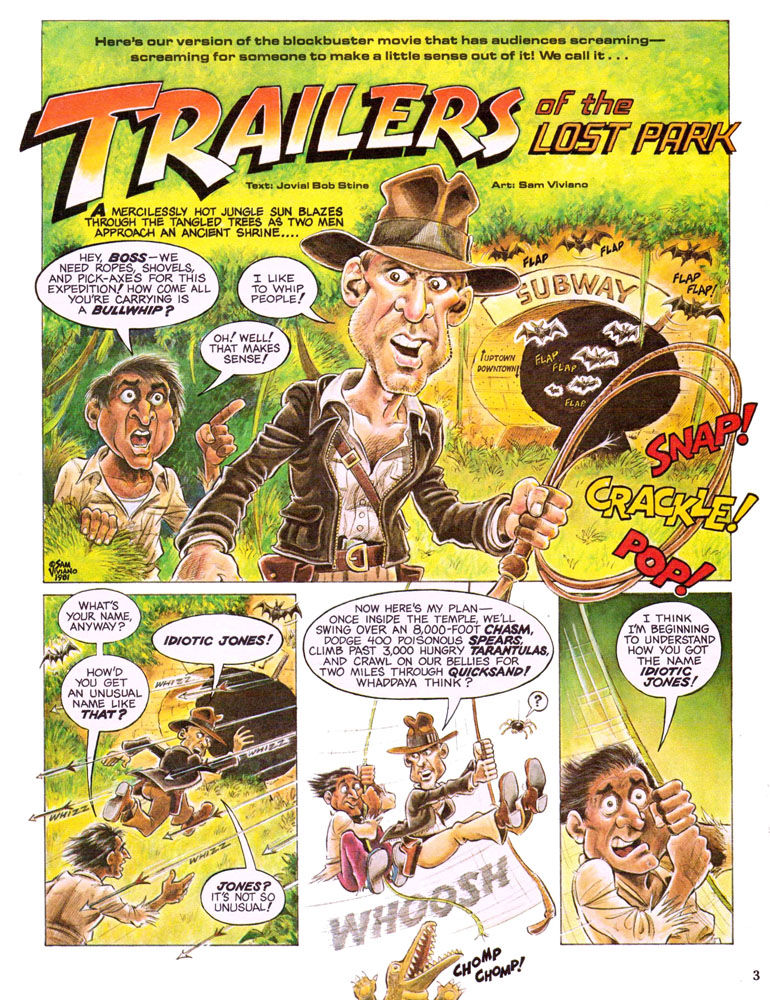 Featuring a 5 page color parody, Trailers of the Lost Park. After Bananas Magazine folded in 1984, Sam Viviano became an artist and art director for Mad, while R.L. Stine wrote Indiana Jones Find Your Fate books and the bestselling Goosebumps series. |
