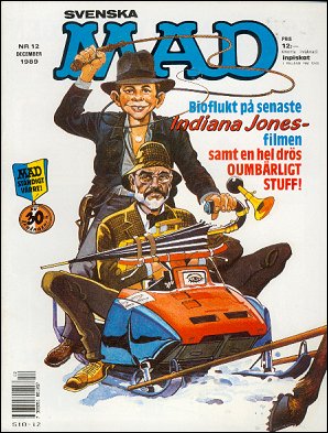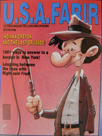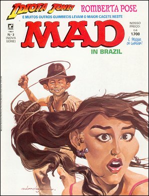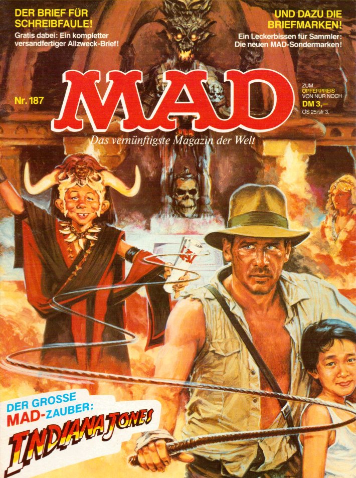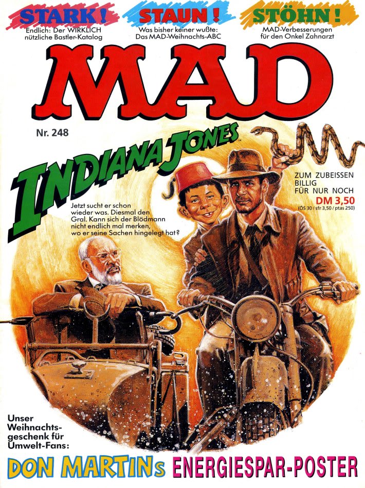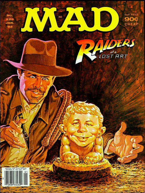 January 1982 #228: Raiders of a Lost Art, October 1984 #250: Inbanana Jones and the Temple of Goons, March 1986 #261: Mad's Do-It-Yourself Indiana Jones Sequel, December 1989 #291: Inbanana Jones and his Last Crude Days. In April 2000, Mad Color Classics #1 reprinted the three movie parodies in color. |