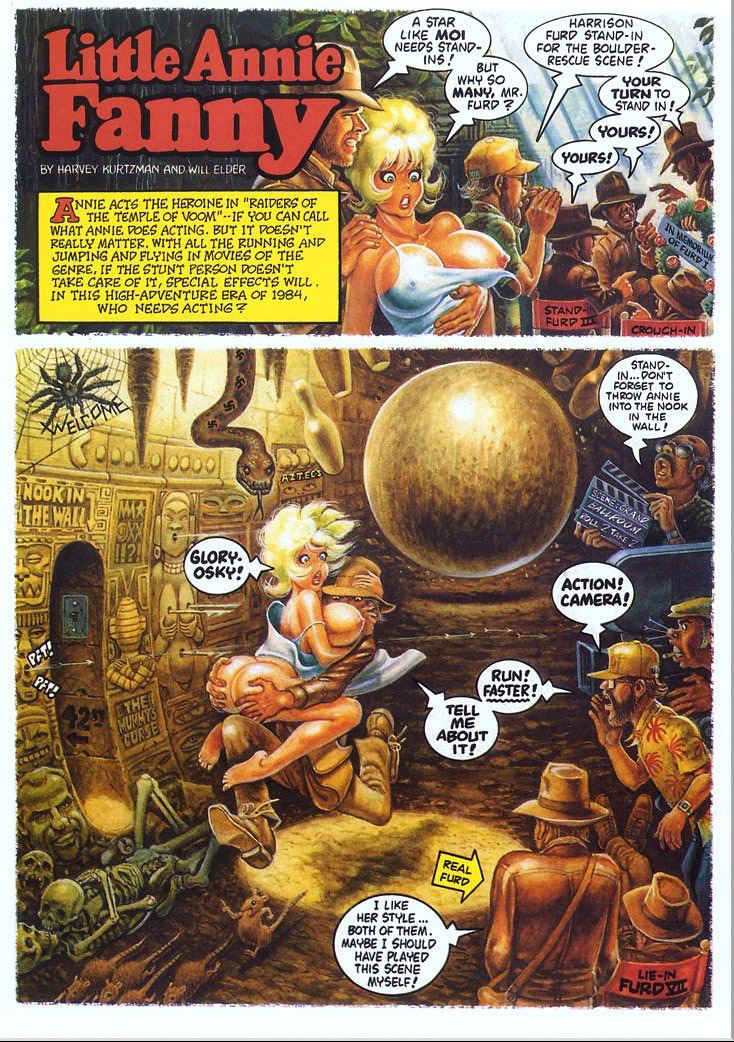 Kurtzman and Elder left Mad Magazine in 1957 and started drawing Little Annie Fanny for Playboy in 1962. "Raiders of the Temple of Voom" features Annie and Harrison Furd's many ill-fated stand-ins filming scenes from the movie in 3 color pages. |
