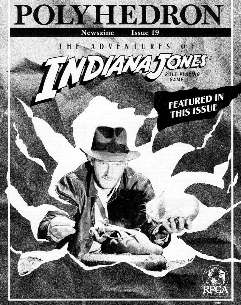 Polyhedron was a magazine which started out as the official publication of the RPGA (Role Playing Gamers Association) in 1981. The target audience was players of the Dungeons & Dragons roleplaying game. This issue includes a solitary scenario for the Adventures of Indiana Jones game and a review of the new TSR game.